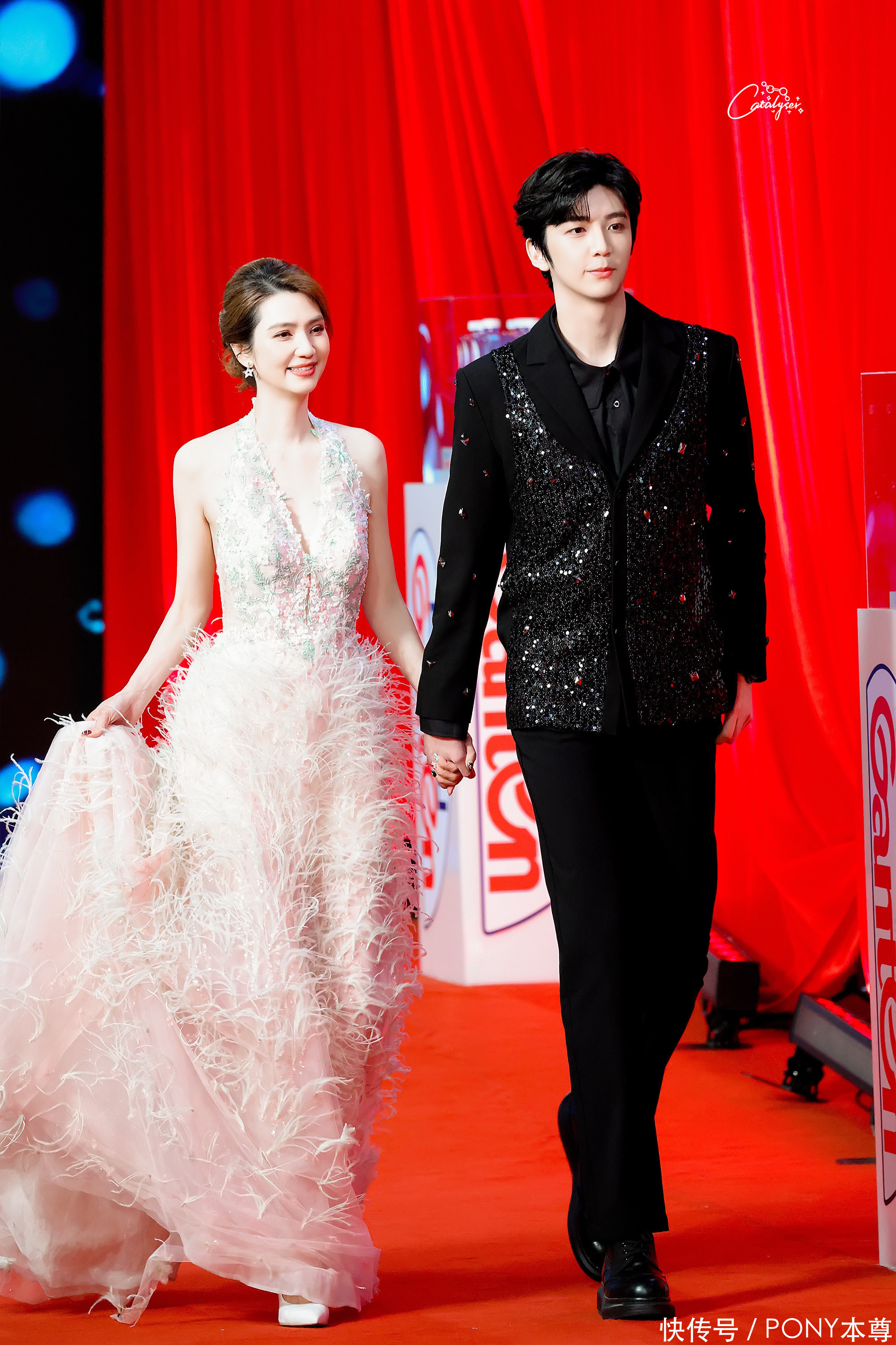 下半身的裙摆设计和羽毛装饰,则让她看起来仙气飘飘!脚踩白色高跟鞋,现场的灯光照耀下,美的很梦幻!
